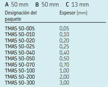 Chapas calibradas “shims” para máquinas serie tmas Fabricadas de acero inoxidable de alta calidad, lo que permite su reutilización.Fáciles de ajustar y retirar.Tolerancias reducidas para facilitar la precisión de la alineación.Espesor marcado claramente en cada chapa.Sin rebabas.Las chapas calibradas precortadas se suministran en paquetes de 10 y también están disponibles en kits completos. Volver al menú Anterior Siguiente